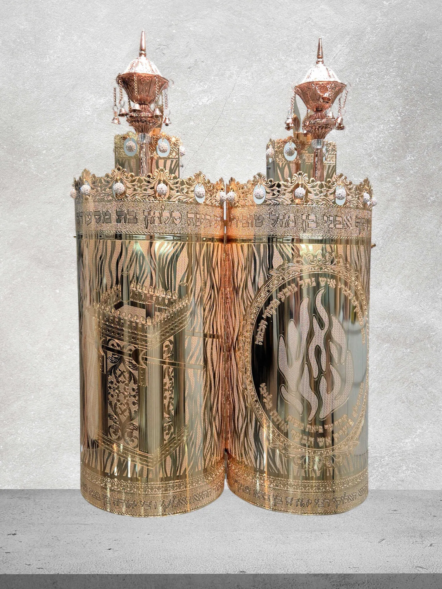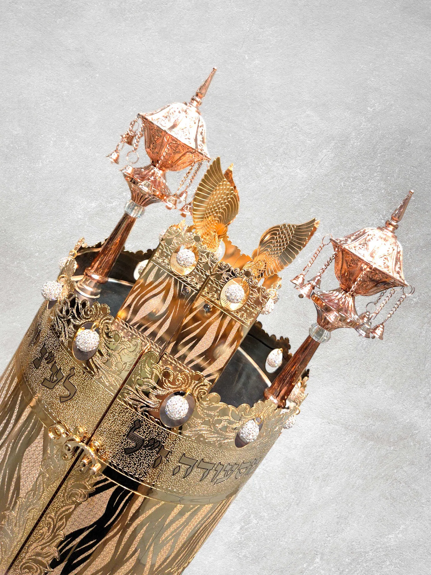 בחלקו העליון מתנוסס כתר מרהיב, מעוטר בפרטים עדינים של כרובים בהשראת בית המקדש.